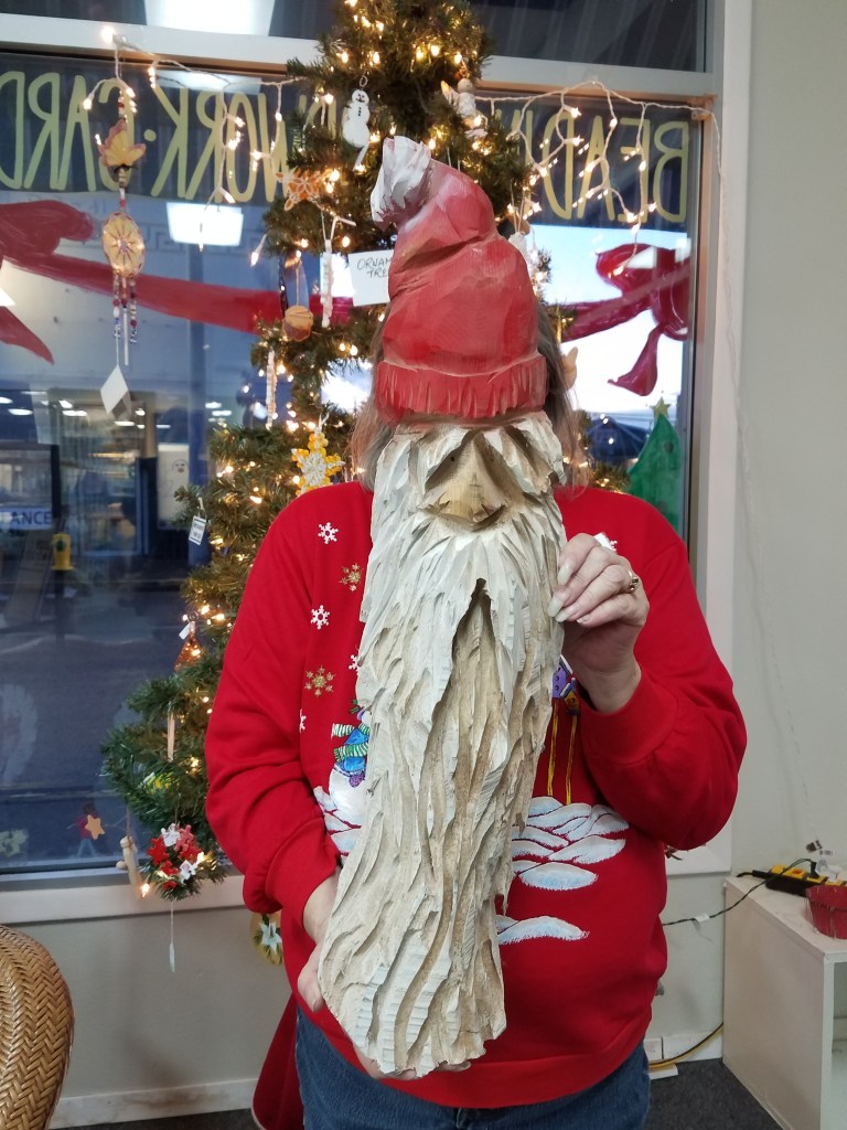 Shop with us during the rest of December and you could win this Santa wall hanging, donated by chainsaw artist Patrick Flanagan. Any purchase gets your name in the pot. We will draw the winner at noon on Christmas Eve. Good luck!