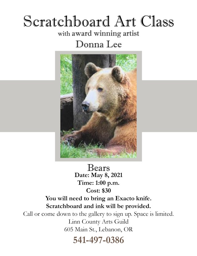 Scratchboard Class – Bears On April 11, 2021 By linncountyartsguildIn Classes The subject for our next scratchboard class will be bears. Sign up today! Share this: Click to share on Facebook (Opens in new window) Facebook Click to email a link to a friend (Opens in new window) Email Click to share on Bluesky (Opens in new window) Bluesky Like Loading... Related