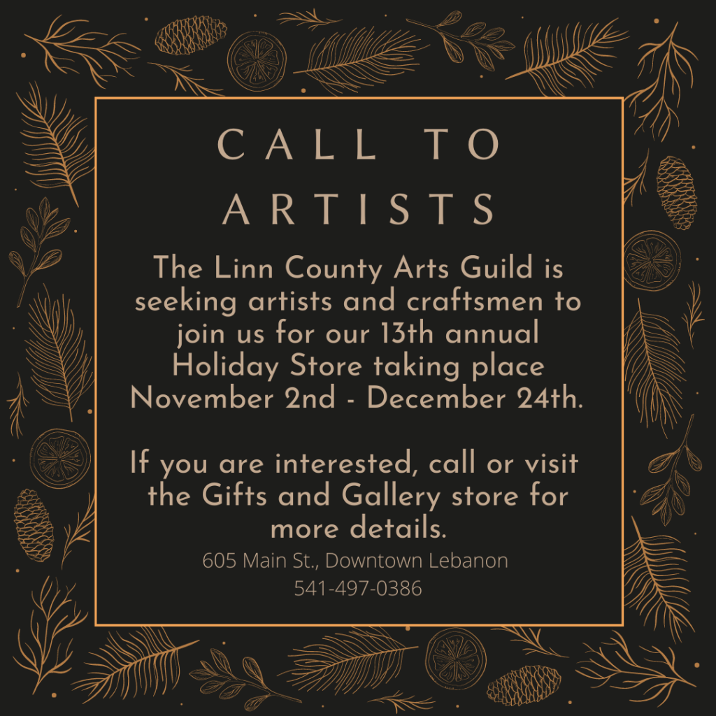 Call to Artists On October 16, 2021 By linncountyartsguildIn Holidays Share this: Click to share on Facebook (Opens in new window) Facebook Click to email a link to a friend (Opens in new window) Email Click to share on Bluesky (Opens in new window) Bluesky Like Loading... Related