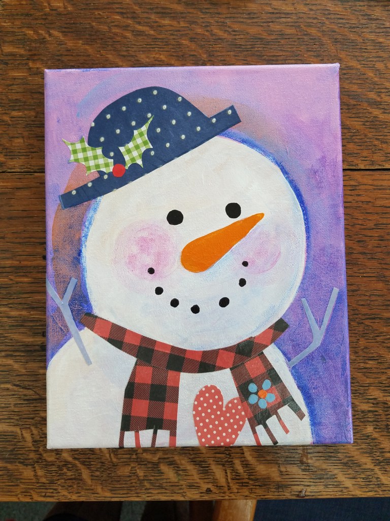 Brynn Carter will lead a class in painting a whimsical snowman on a canvas panel. Use acrylic paints, scissors, colorful papers and your imagination to create a cheery snow person collage on an 8×10 inch canvas.  The only requirement is basic cutting skills.  Limited to 8 participants.. Please call or come in to sign up.