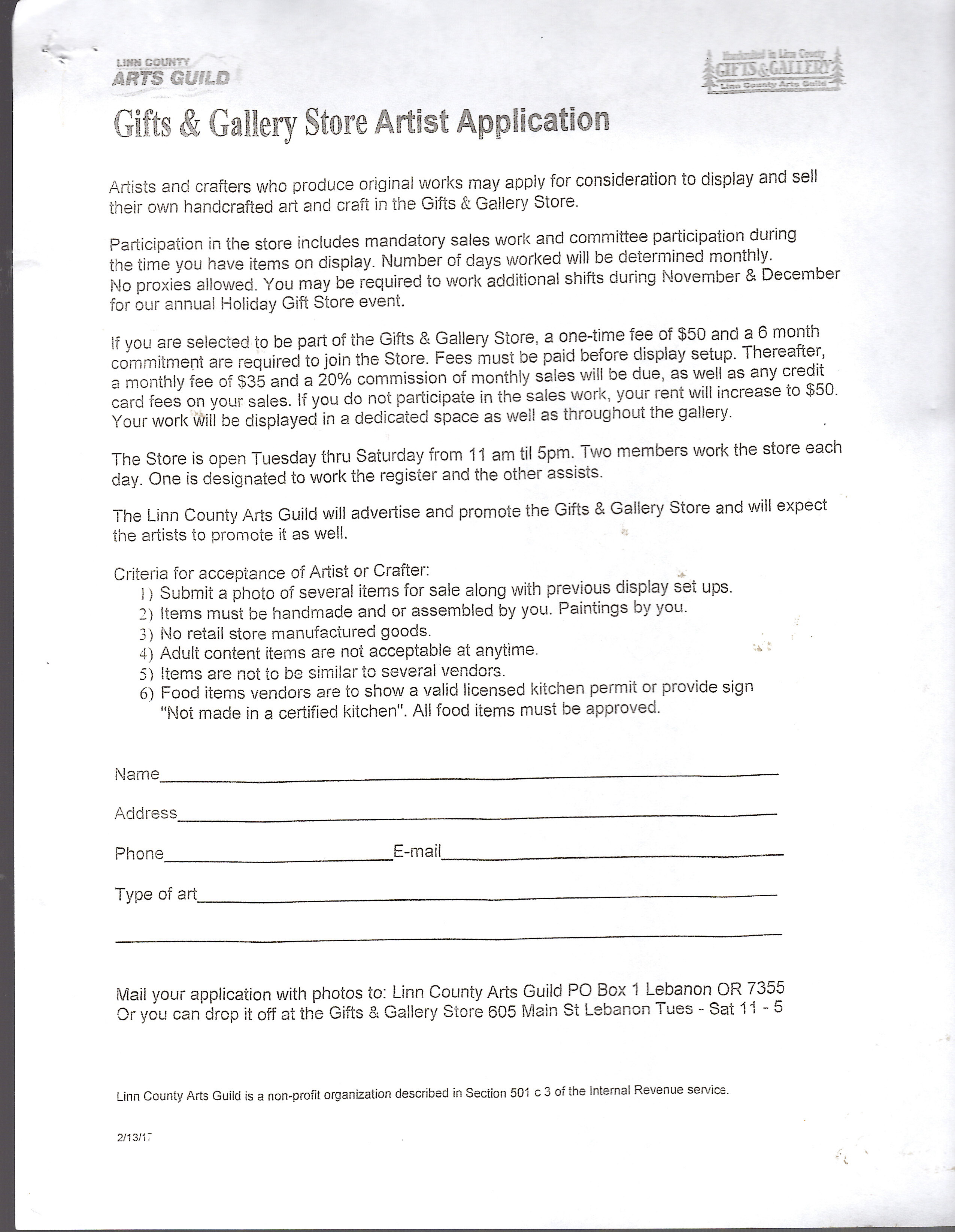 Calling all Local Artists! We have limited space to accept new vendors in the Gift & Gallery Store. Please stop in an get an application or attend our monthly meeting held at the store the first Monday of the month at 6:30 pm (except for holidays then 2nd. Monday) in the store at, 605 Main Street in Lebanon.